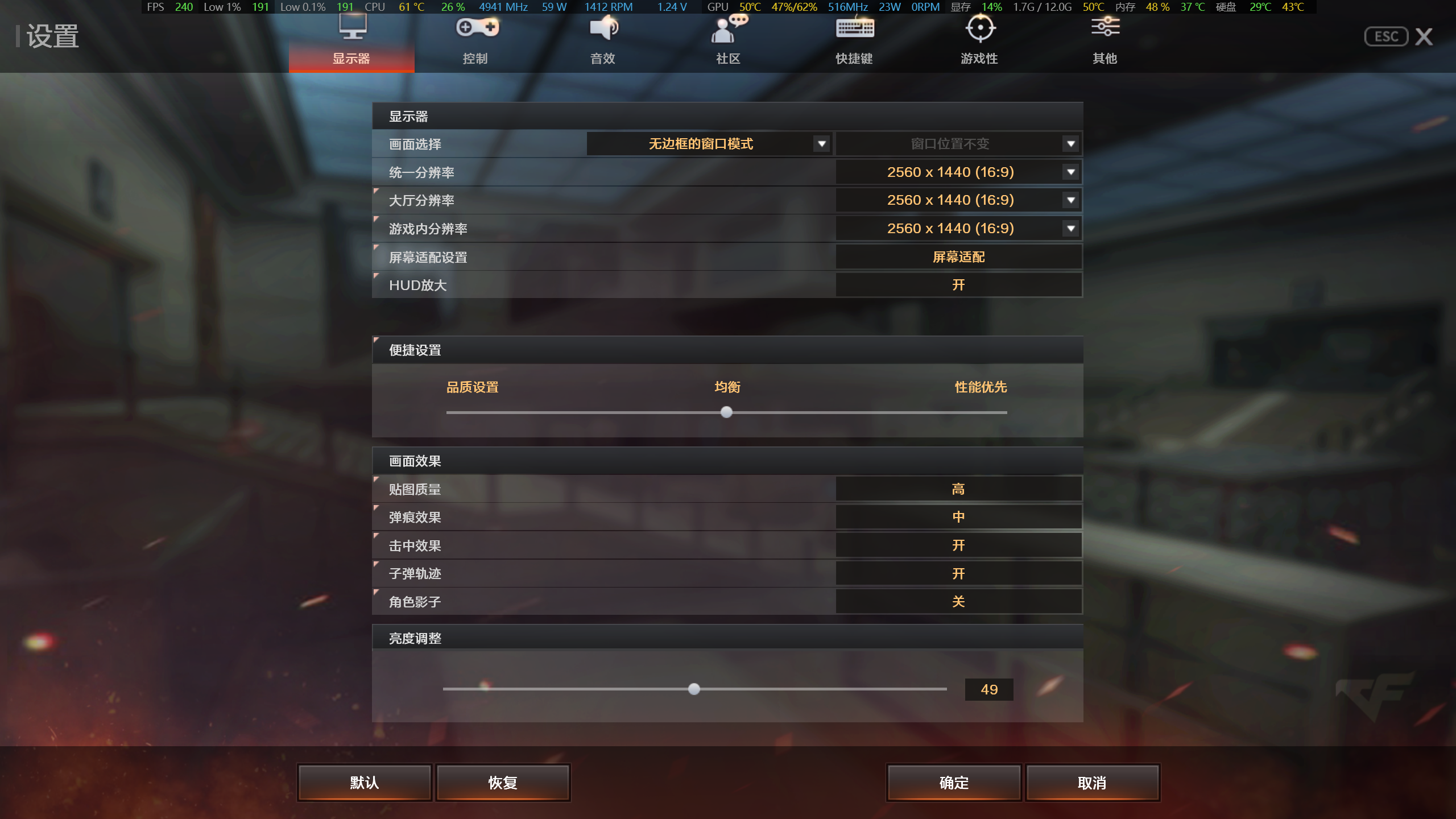 当前设置为“全屏窗口”显示模式,分辨率选择为2560x1440(16:9)。图形质量设为“自定义”,整体画质为“中”。具体图形选项中,纹理质量设为中、阴影质量为低、后期处理为中、特效质量为中、抗锯齿则关闭。