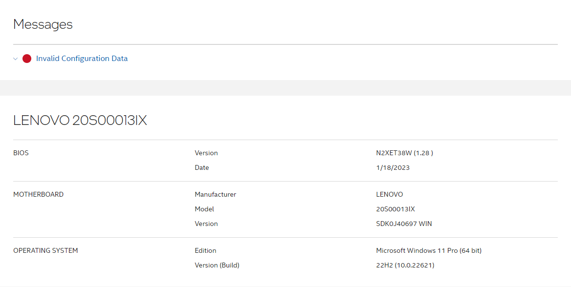 Thank you for reaching out to us with your concern about the "Invalid Configuration Data" error you encountered while using the Intel® Driver & Support Assistant. We apologize for any inconvenience this has caused you, and we're here to assist you in resolving this issue.