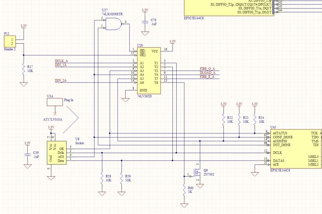 http://i1008.photobucket.com/albums/af207/matthew_db/work/config.jpg?t=1255448620 The 6 net tagged lines going in or out of the 74LV365 are going to GPIO pins over a short ribbon cable. I can use the AT17LV010 during development and as a backup plan. For early production the AT17LV010, the socket and the header would be no place. If this works, they can go at a later version of the board. I went ahead and included both DATA[0] and DCLK since there are extra gates on a hex tri-state buffer.- Mark as New
