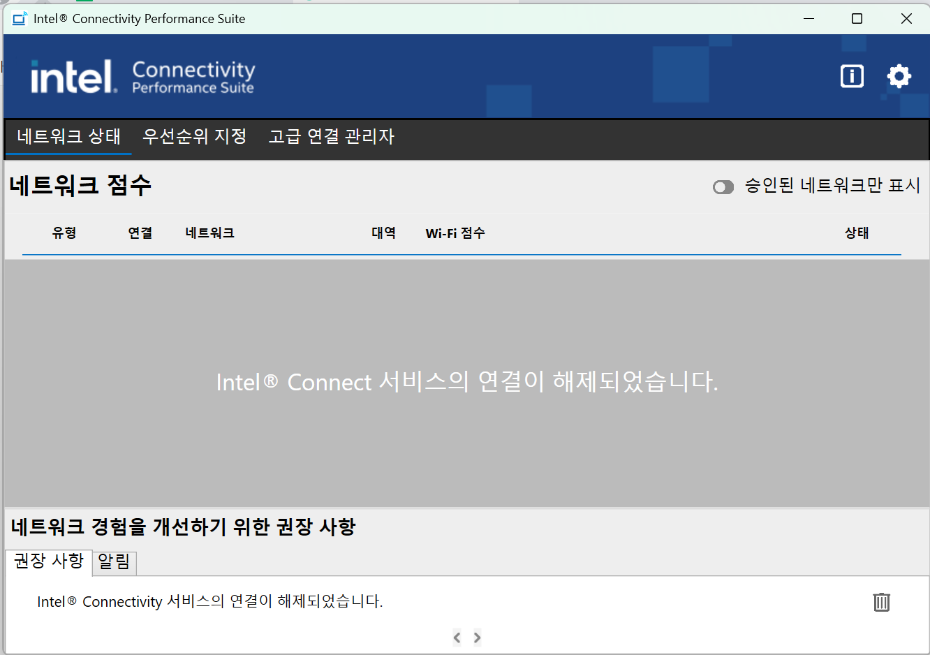 Intel(R) Connectivity Performance Suite 하드웨어 항목이 감지되지 않았다고 뜹니다.